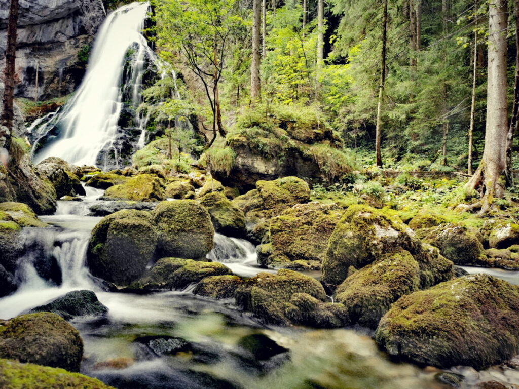 Der Regen trägt wesentlich zur mystischen Stimmung bei, die den Wasserfall umgibt. Der umliegende, schattige Wald wird in ein dichtes, sattes Grün getaucht, dessen Farben durch die Nässe intensiviert werden. Die Felsen und Steine bekommen einen dunkleren Farbton, was einen starken Kontrast zu dem schäumenden Wasser bildet. In Kombination mit dem leichten Sprühnebel, der bei hohem Wasserstand ohnehin aufsteigt und sich bei Regen mit den tief hängenden Wolken vermischt, wirkt die gesamte Szenerie oft nebelverhangen und geheimnisvoll. Diese Atmosphäre erinnert an romantische Gemälde und bietet hervorragende, stimmungsvolle Fotomotive.